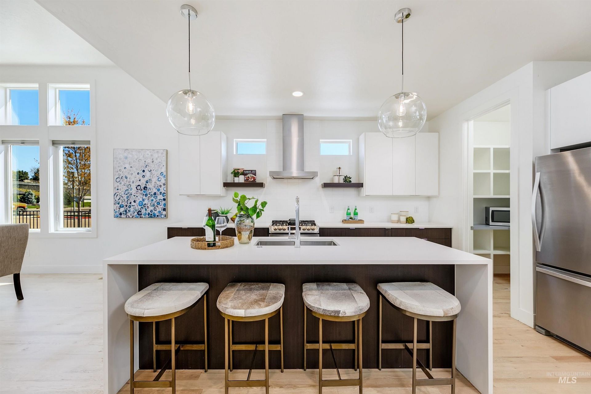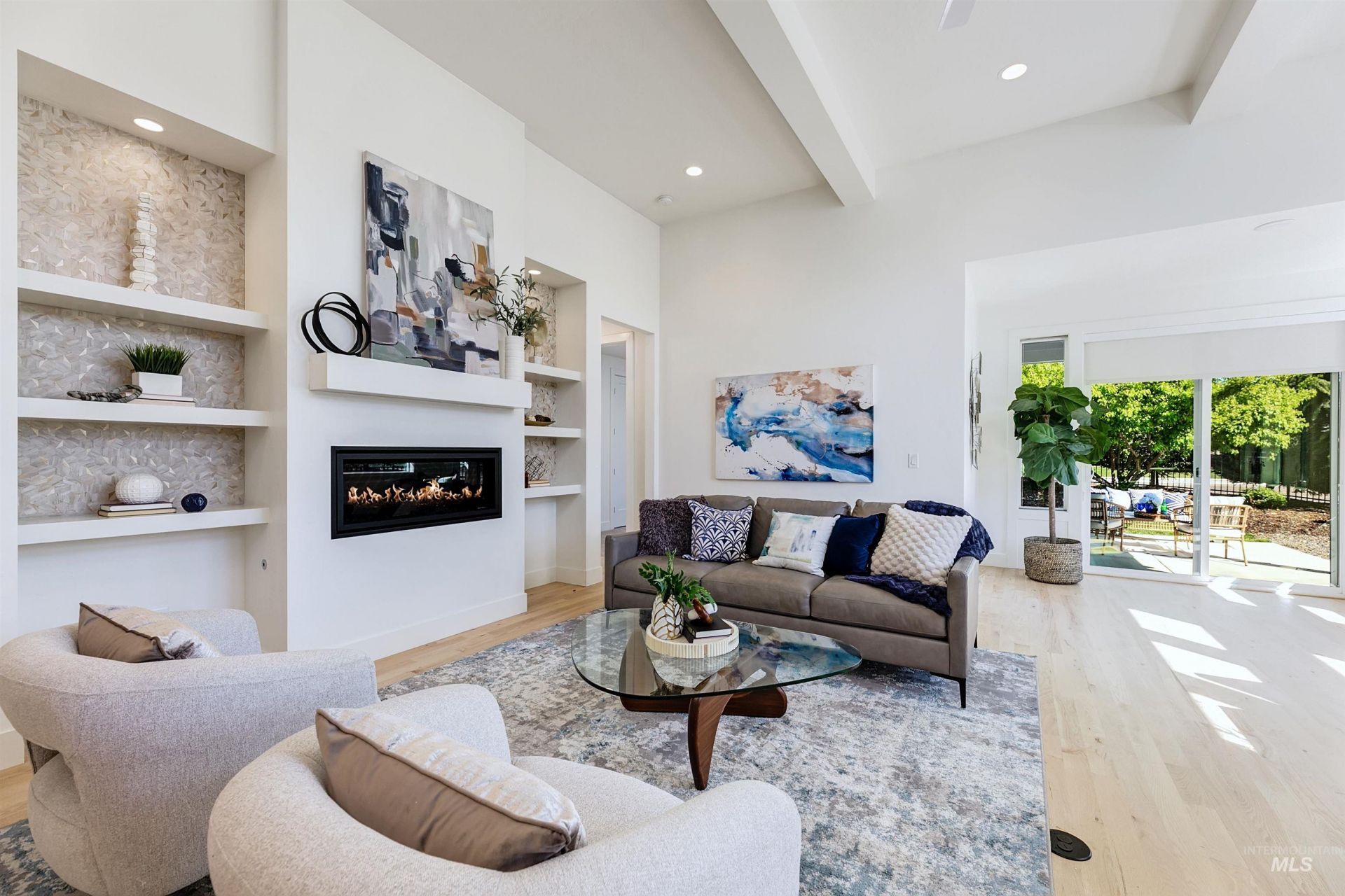 Your opportunity to own a turnkey home in one of Eagles most connected and desirable locations - where everything you love about downtown is just moments away. This exceptional single-level residence offers a blend of premier location, refined finishes, and effortless living. Walk or take a one-minute bike ride to dining, shopping, and everyday conveniences, then come home to a beautifully designed and modern residence. Inside, the home is filled with natural light and defined by rich hardwood floors, 12-foot ceilings with exposed beams, and expansive living spaces that balance comfort with elevated design. A gas fireplace with custom built-ins anchors the great room, while 8-foot interior doors and designer window treatments enhance the homes modern aesthetic. The kitchen features soft-close cabinetry, quartz countertops, and a waterfall island designed as a central gathering space. Thoughtful details include a sleek hood, built-in desk, open shelving, and both toe-kick and under-cabinet LED lighting. Designed for indoor-outdoor enjoyment, the backyard offers an extended covered patio and professionally landscaped grounds - ideal for entertaining. This property provides quick access to nearby parks, the Boise River Greenbelt, and foothill trails for year-round recreation.